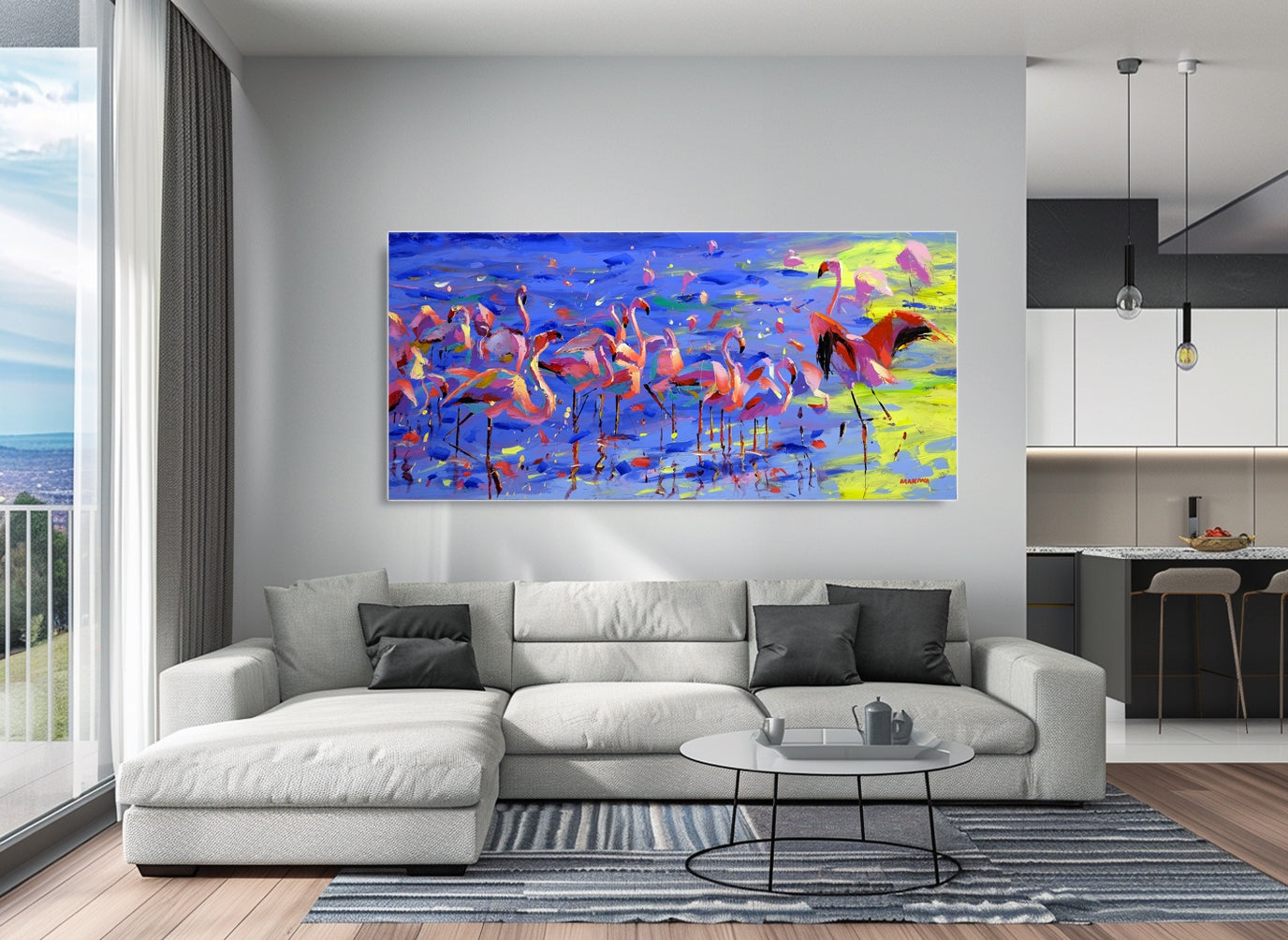This painting, captures the elegance and vibrancy of flamingos in their natural habitat. The use of bold colors and dynamic brushstrokes creates a sense of movement and life, making this piece a stunning addition to any collection.